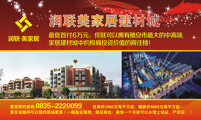 潤聯(lián)美家居建材城,位于四川雅安市,由香港潤聯(lián)國際投資有限公司投資,雅安市潤聯(lián)投資置業(yè)有限公司開發(fā)并傾力打造的雅安市中高端家具建材飾品以及家裝一體化的大型生態(tài)型家居購物MALL。
