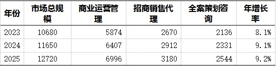 表1:2023-2025年中國(guó)商業(yè)地產(chǎn)服務(wù)行業(yè)市場(chǎng)規(guī)模(單位:億元)
